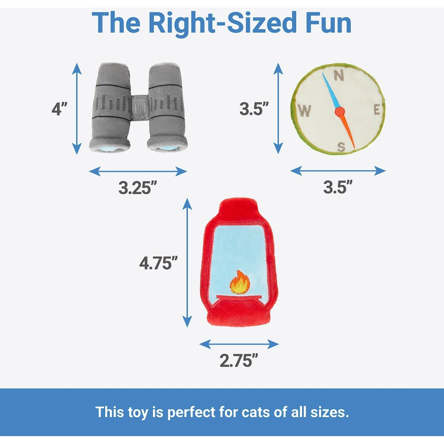 - Your kitty gets three plush toys in one—a pair of binoculars, a compass and a lantern.